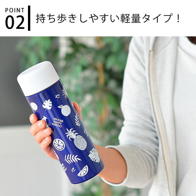 商品名ハレイワ ダイレクトステンレスボトル フルーツ 490ml商品詳細サイズ本体:約W66×H210mm口径:約φ50mm重量約223g容量490ml素材本体胴部:ステンレス鋼(アクリル樹脂塗装)本体内ビン:ステンレス鋼フタ・飲み口:ポリプロピレンフタパッキン・飲み口パッキン:シリコーンゴム保温・保冷効力保温:65℃以上(約6時間)保冷:10℃以下(約6時間)備考■食器洗い洗浄機、食器乾燥機は使用しないでください。